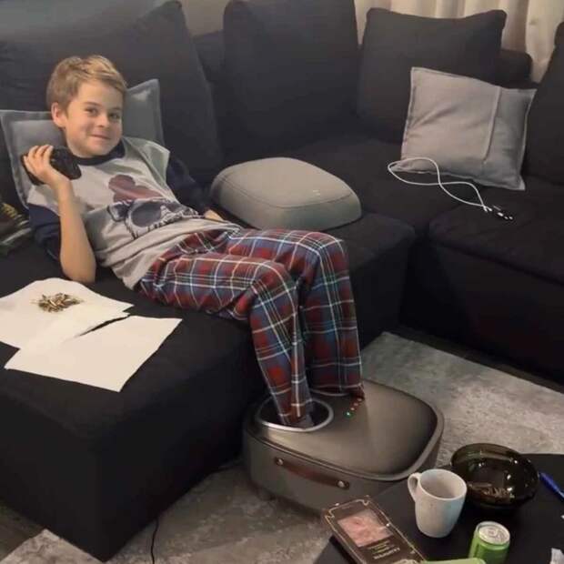 Сергей Лазарев поделился забавными кадрами с участием своего 11-летнего сына Никиты. Парень удобно расположился на диване с семечками в руках и массажным устройством на ногах.