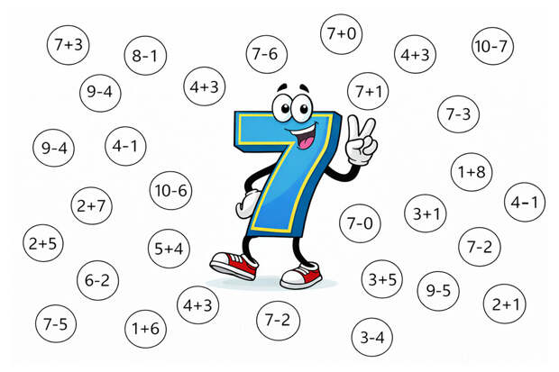Задание представляет из себя лист, на котором вразброс написаны примеры. Перед ребенком стоит задача: внимательно посмотреть на каждый пример и обвести только те, у которых в результате получается нарисованное в центре число.