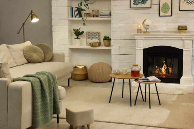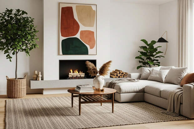 Декоративные дрова можно разместить в открытой нише рядом с очагом: аккуратная поленница сама по себе становится элементом декора. Если выбираете камин с имитацией топлива, обратите внимание на модели с керамическими камнями — они выглядят естественнее и усиливают эффект тепла.Для текстиля действует правило «одного оттенка в трех фактурах»: например, бежевый лен на подушках, бежевая шерсть пледа и бежевый хлопок штор. Разница текстур создает глубину, а единый тон — спокойствие. Растения у камина лучше выбирать засухоустойчивые: сансевиерия или замиокулькас хорошо переносят теплый воздух.