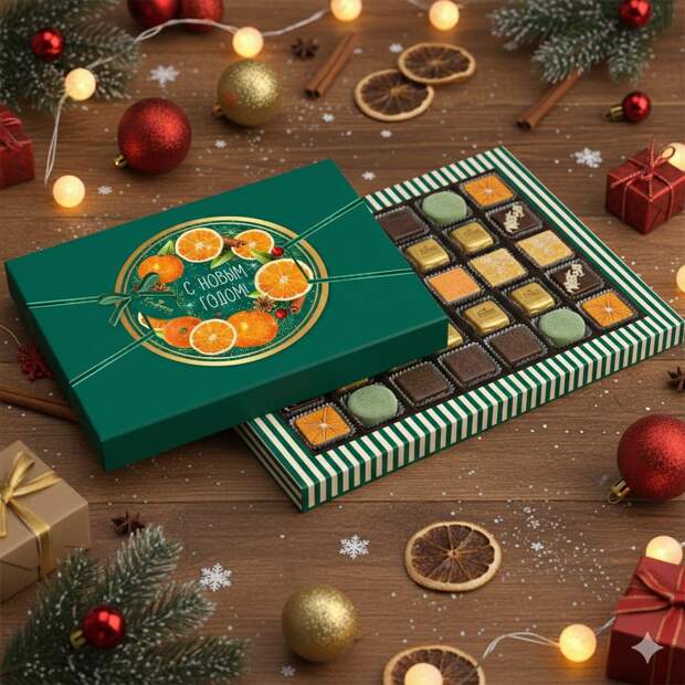 Элегантная изумрудная коробка с графикой апельсинов задает тон всему подарку. Внутри — авторский шоколад с начинками (фисташка, манго-маракуйя, миндаль), ручной желейный мармелад и суфле. Вкусы выстроены гармонично: от ярких цитрусовых акцентов до благородной горькой ноты в финале. Идеальный формат для корпоративного или семейного презента.