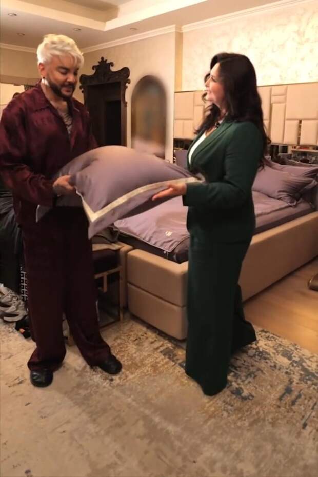Рядом с большой кроватью стоят две тумбочки, а на стенах висят картины, показывать которые король российского шоу-бизнеса отказался — при монтаже их «замазали». Кстати, сын Киркорова — 13-летний Мартин тоже спит на шелковых простынях с вышитым гербом и инициалами. Похожий комплект можно встретить и в гостевой комнате. «Чтобы гости не забыли, к кому они приехали», — пошутил Филипп.