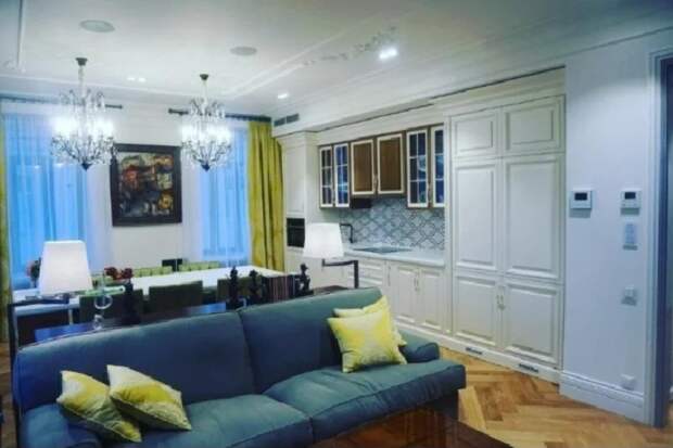 Сначала квартира Бабкиной была разделена на несколько маленьких комнат, и простор в ней ощущался слабовато. Дизайнеры решили убрать перегородки и создать большую гостиную площадью 60 квадратных метров. Гостиная была поделена на зоны для отдыха, готовки и рабочего места с помощью стильной мебели.