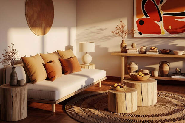 Почему работает: объемная фактура добавляет уют и визуальную глубину. Плед, небрежно брошенный на диван, или кресло создает эффект обжитого пространства, а не выставочного шоурума.