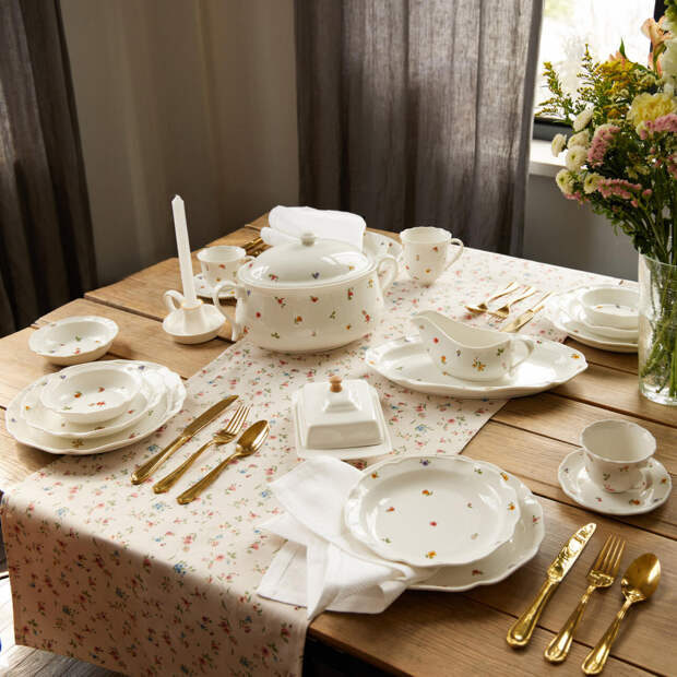 Тарелки, чашки, пиалы с геометрическими узорами, асимметричными формами или в технике керамики ручной работы (неровные края, видимые следы лепки). Очень хорошо смотрятся монохромные варианты: черный, белый, терракотовый или серо-голубой.
