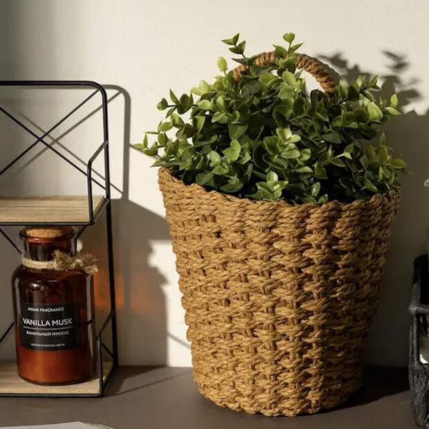 Почему работает: плетение вручную всегда считывается как дорогой прием, даже если корзина массового производства, натуральный материал и неидеальная текстура создают иллюзию уникальности.