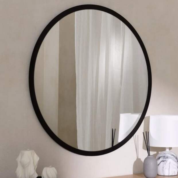 Почему работает: круг – графичная форма, которая легко вписывается в любой стиль. Металлическая рама выглядит современно и дорого, особенно если выбрать матовое покрытие без лишних декоративных элементов.