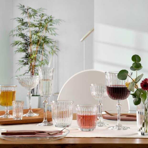 Рифленые стаканы, бокалы с вертикальными гранями и графичные формы мгновенно добавляют сервировке «дизайнерский» уровень, даже если это масс-маркет. Обратите внимание на коллекции вроде Pasabahce Joy: за счет игры света на гранях обычная вода или вино выглядят эстетичнее, а стол — продуманнее. Такая посуда хорошо работает как самостоятельный акцент и не требует сложного декора — достаточно нейтральной скатерти и пары свечей.