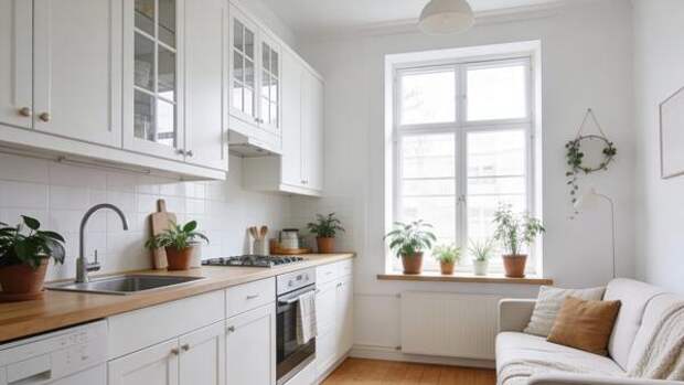 ru» считает, что такая позиция – совершенно неправильна. При помощи незамысловатых приемов вашу кухню можно сделать больше – как визуально, так и с точки зрения просторности. Иначе говоря, сделать ее менее тесной.Для начала, автор канала советует заменить стекла в фасадах верхних шкафов на рифленые. Этим вы добьетесь сразу двух целей – отражая свет, они визуально увеличат пространство, и, к тому же, помогут вам скрыть содержимое шкафов, что отнюдь не бесполезно. Далее – если вы решили обновить кухонную мебель, автор советует выбирать модели с белыми фасадами и со скрытыми ножками или настенным креплением. Такие «парящие» над полом полки и шкафы помогут комнате казаться больше. Чтобы добавить уюта отдайте предпочтение латунной фурнитуре перед никелированной. Того же эффекта можно добиться при помощи дополнительной подсветки под шкафами или на полках. Чтобы сделать кухню еще уютнее, автор канал советует отказаться от стульев пользу компактного диванчика и выбрать маленький круглый столик.