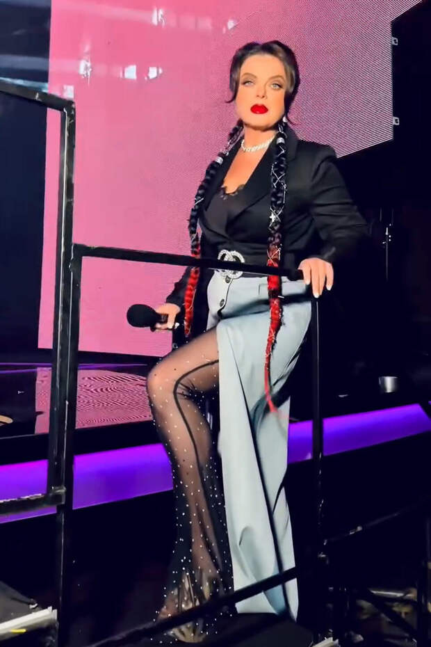 Детали, которые кричат громче певицы. Расстегнутые пуговицы до опасной зоны и брюки в сетку со стразами — перебор даже для сцены. Косы с красными и черными прядями выглядят как подростковый эксперимент, который затянулся. Что улучшить: юбку застегнуть, брюки заменить на плотные черные колготки, пиджак носить навыпуск, волосы уложить в гладкий пучок. Из дерзкого тинейджера превращаемся в элегантную даму.