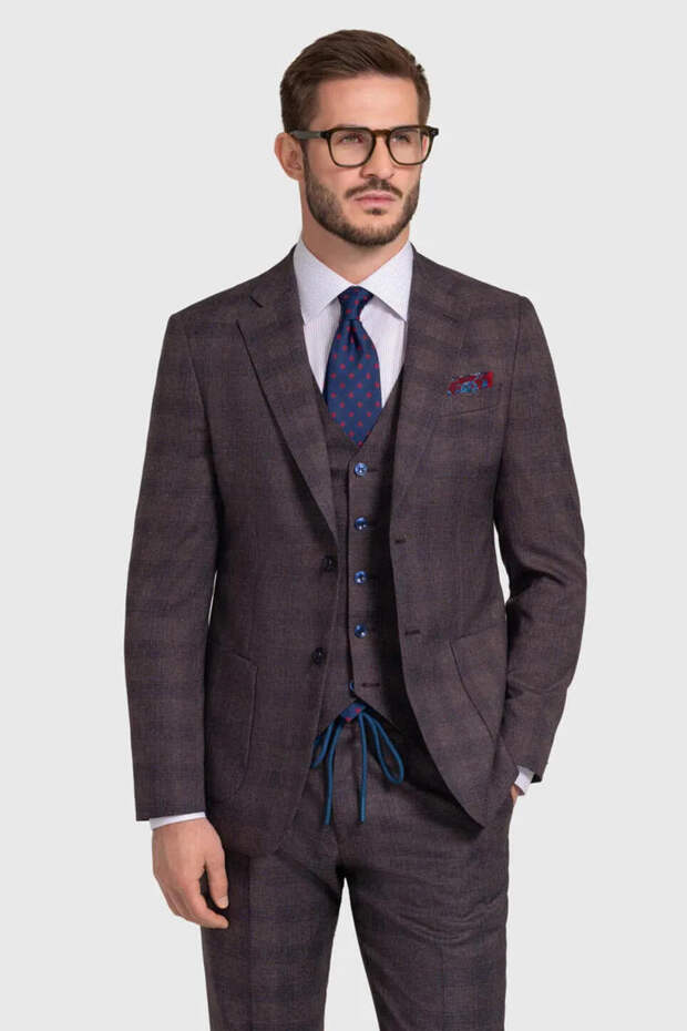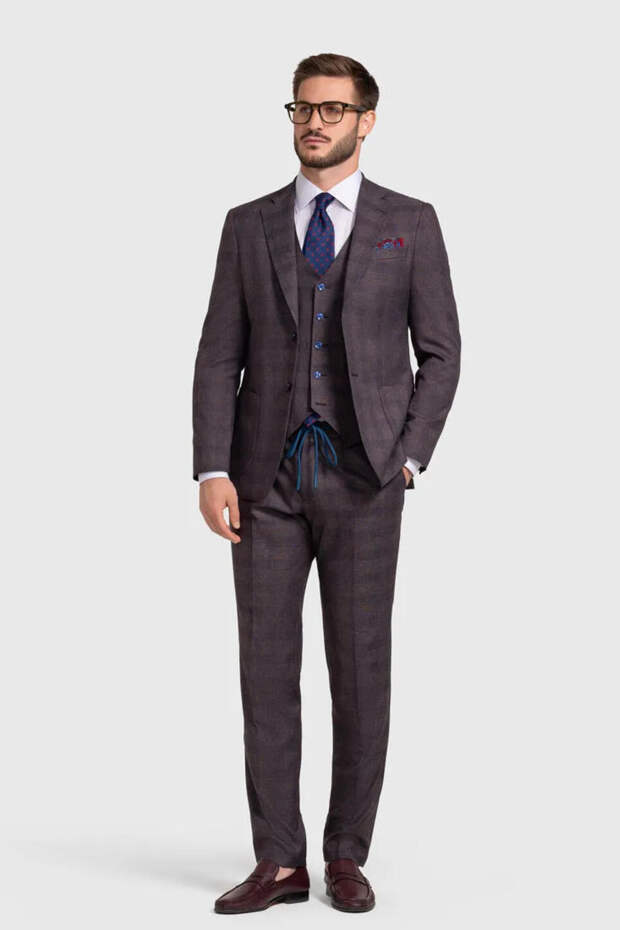 Ткань: тонкая шерсть в разных сочетаниях. Она отлично держит форму и выглядит солидно, подчёркивает статус владельца. Например, шерсть и шелк позволят чувствовать себя комфортно в помещении и на улице под солнцем. Можно также рассмотреть варианты из хлопка или льна.