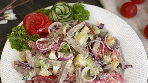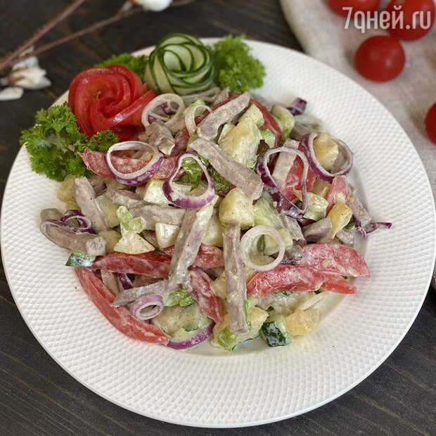 Нежный отварной язык хорош сам по себе как деликатесная закуска. Но с ним можно приготовить и разнообразные салаты. Поделюсь нашим любимым семейным рецептом. Ингредиенты этого сытного и очень вкусного салата отлично сочетаются.