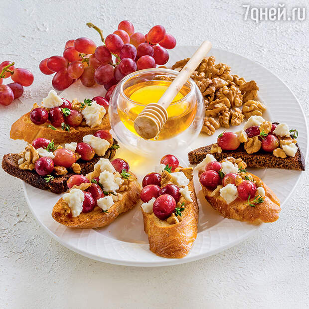 Духовку предварительно разогреть до 180 °С. Виноград отделить от веточек, поместить в глубокий противень, посолить, поперчить и слегка сбрызнуть оливковым маслом. Запекать виноград в разогретой духовке 5—7 минут. Хлеб выложить в противень и подсушить в разогретой духовке до образования золотистой корочки. Орехи порубить ножом на крупные кусочки и перемешать с листьями тимьяна. Чеснок почистить и разрезать пополам. Обжаренный хлеб натереть срезом зубчика чеснока и сбрызнуть оливковым маслом. Козий сыр поломать руками на небольшие кусочки. Выложить на блюдо хлеб, а сверху — запеченный виноград, посыпать орехами с тимьяном, разложить кусочки сыра и полить медом.