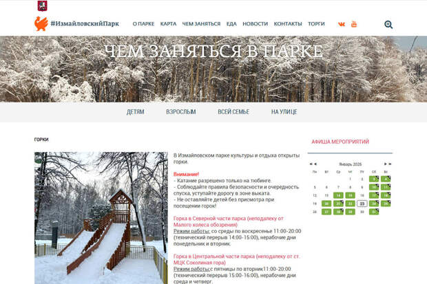 В Измайловском парке есть две небольшие горки для катания на ватрушке, на которые не страшно прийти с малышами. Одна из них расположена в северной части парка рядом с Малым колесом обозрения, а другая — в центральной части парка, неподалеку от метро Соколиная гора.