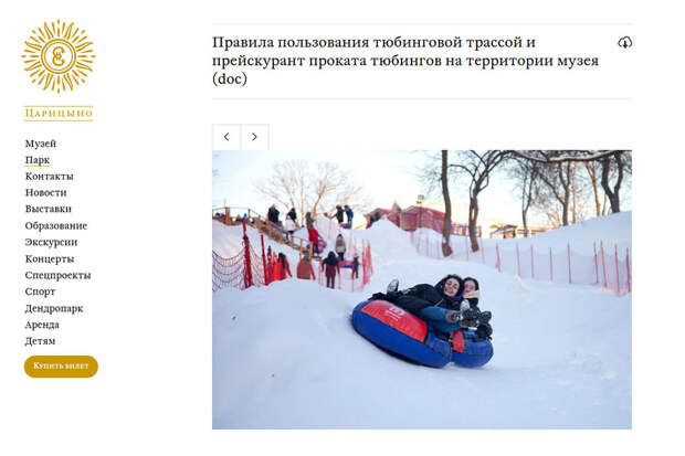 Зимой в Царицыно в том числе приезжают, чтобы прокатиться на тюбинге по снежной трассе, расположенной на естественном 120-метровом склоне. Она имеет оптимальный уклон для спуска «с ветерком» и окружена гибкими заграждениями, обеспечивающими безопасность. Специальных подъемников здесь нет: подниматься обратно нужно пешком по деревянной лестнице. Зато есть сказочные виды на парк, Большой мост XVIII века и старинную архитектуру.