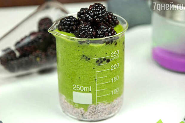 - Выложите пудинг с чиа ровным слоем на дно двух стаканов, полейте сверху смузи и украсьте стаканы парой ягод ежевики