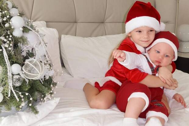 Лиана поделилесь серией снимков, на которых малыш и его сестренка Селин позируют в красных новогодних шапочках и костюмчиках. Селин сидит на кровати и обнимает братика, рядом стоит маленькая елка, украшенная белыми игрушками.