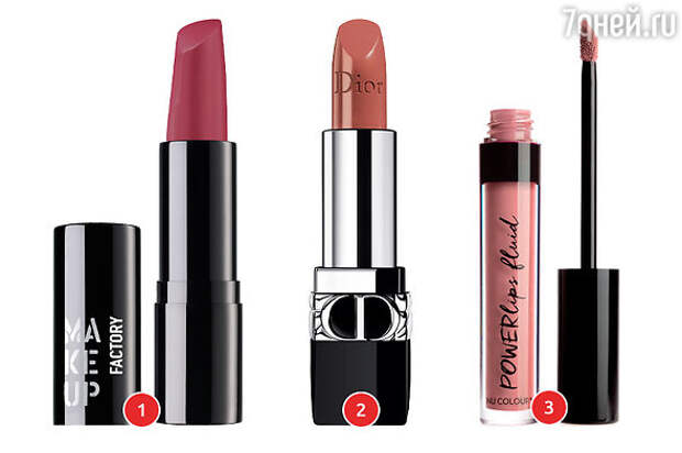 1. Стойкая смягчающая помада для губ Complete Care Lip Color Make Up Factory. 2. Помада Rouge Dior. 3. Суперстойкая матовая жидкая губная помада Powerlips Fluid Matte Persistence Nu Colour.