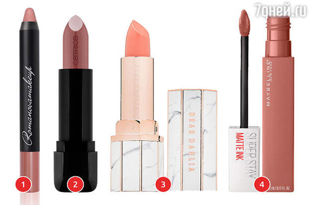 1. Помада-карандаш для губ Sexy Lipstick Pen Romanovamakeup. 2. Губная помада Full Satin Lipstick Catrice. 3. Помада Lip Paradise Intense Satin Dear Dahlia. 4. Помада Super Stay Matte Ink Maybelline New York.