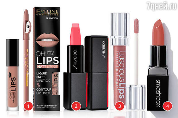 1. Набор Oh! My Lips Matt Lip Kit Eveline Cosmetics. 2. Помада Modern Matte Shiseido. 3. Бальзам-пламперы для губ Luscious Lips. 4. Помада Be Legendary Smashbox.