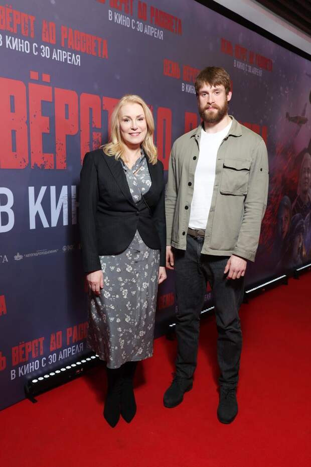 Шукшина появилась на премьере в элегантном образе: она надела серое платье с цветочным принтом и укороченный пиджак. Ее сопровождал 28-летний сын Макар Касаткин, который редко появляется на публике. Он изменил имидж и отпустил густую бороду.