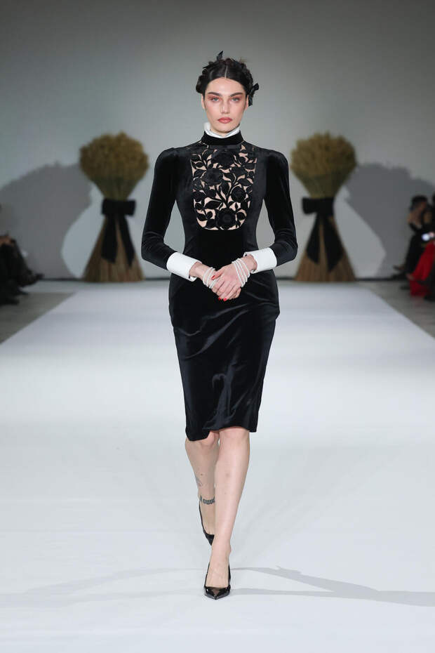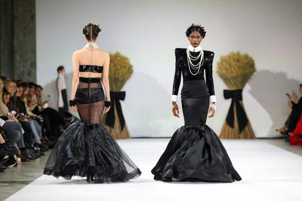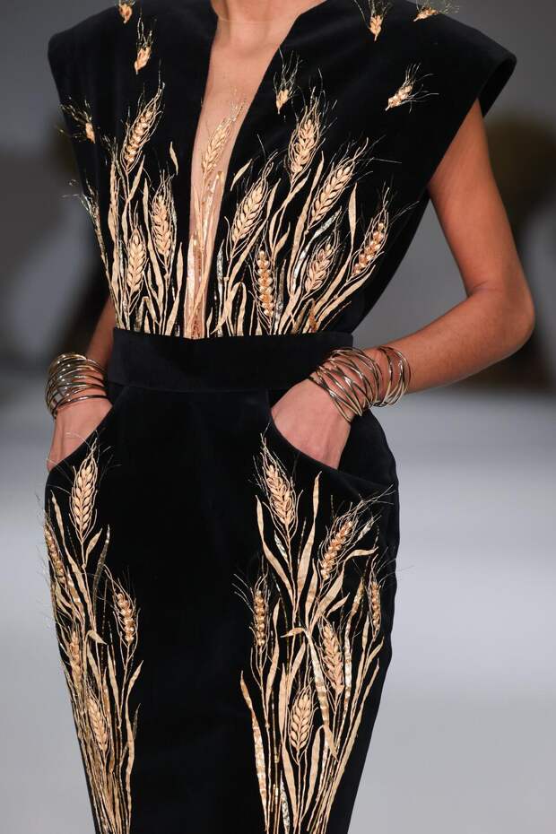 Золотые колосья, выполненные вручную, украшали многие наряды, демонстрируя филигранное мастерство вышивальщиц Дома, которые использовали натуральную рафию, соломку, стеклярус и традиционные русские техники шитья.