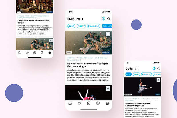 Последний пункт меню ЯRUS заслуживает особого внимания: это не только актуальная «афиша» мероприятий — фильмов, концертов, спектаклей, экскурсий и т. п., но и лента событий, создаваемых пользователями, — они могут добавлять свои активности и приглашать других людей в них участвовать.