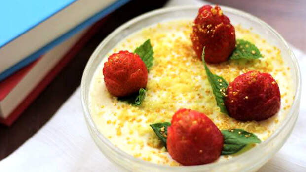 - Посыпьте смузи измельченной апельсиновой цедрой, украсьте клубникой и листьями мяты.