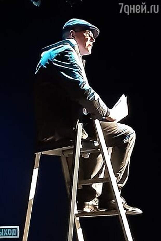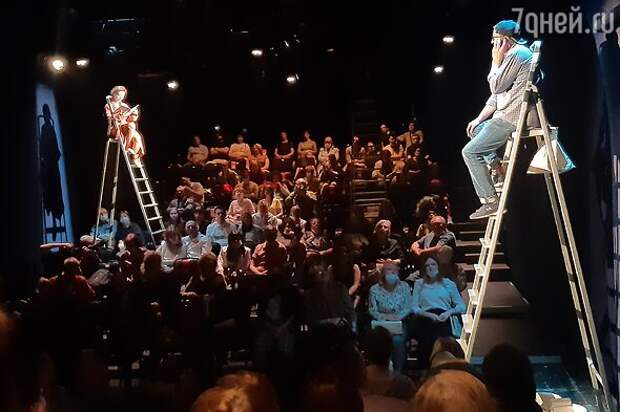 Спектакль идет в оригинальной обстановке (вход со двора и вверх по лесенке под крышу театра). Зрители в зале садятся по две стороны от прохода, где, собственно, и будет туда-сюда сновать главный герой, символично со всех сторон зажатый зрительскими рядами – и обстоятельствами (сценография художника Давила Боровских). Прямо посреди зрительских рядов устроены высоченные лестницы-стремянки, на которые в разных эпизодах взбираются очередные собеседники главного героя. Оттуда, с высоты своего положения, каждый приводит в пример аргументы своей правоты, периодически спускаясь друг к другу в поисках более близкого контакта.