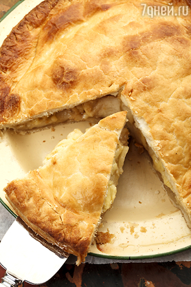 - Слегка смазать верхнюю часть пирога взбитым яйцом и кончиком ножа сделать небольшие прорези в центре для выхода пара..