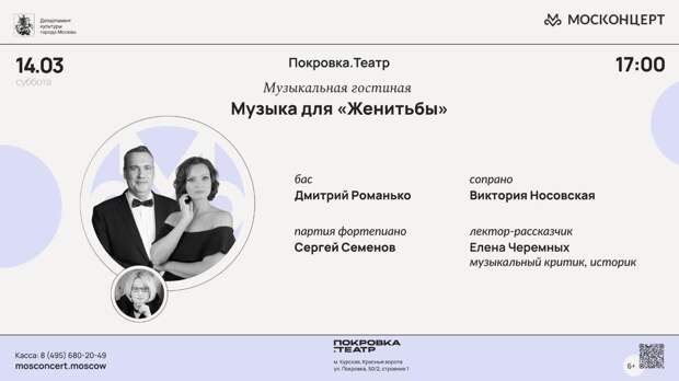 «Москонцерт и «Покровка.Театр» приглашают посетить «Музыкальную гостиную»! Третья из цикла лекция-концерт «Музыка для “Женитьбы”» приурочена к спектаклю «Женитьба» по пьесе Н. Гоголя. Историк музыки Елена Черемных расскажет о легендарной гоголевской пьесе, а музыкальные характеристики персонажей представят солисты Москонцерта – Виктория Носовская (сопрано) и Дмитрий Романько (бас). В программе прозвучат романсы и арии М. Глинки, А. Даргомыжского и др. Партия фортепиано – Сергей Семенов.