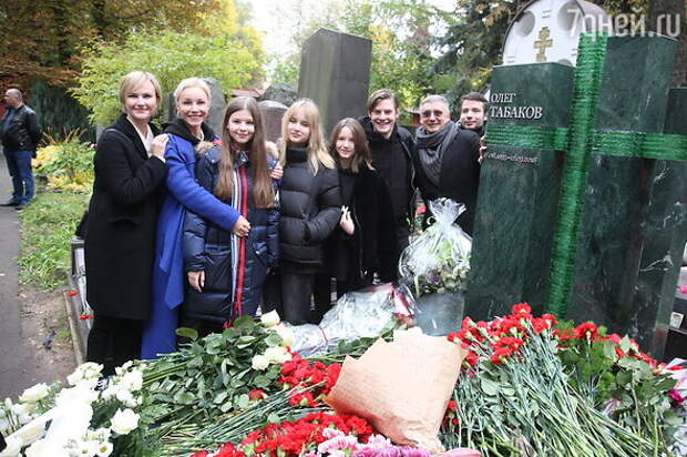 Памятник всенародно любимому актеру, режиссеру и театральному деятелю Олегу Павловичу Табакову открыли на Новодевичьем кладбище. На церемонии присутствовали родные создателя «Табакерки» — жена Марина Вячеславовна Зудина и детьми Павлом и Марией и сын Антон Табаков со своими детьми.