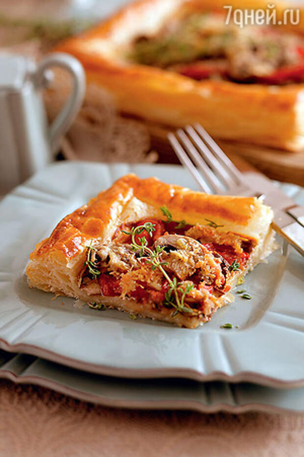 Духовку предварительно разогреть до 190 °С. Сухие грибы залить горячей водой. Тесто предварительно разморозить и слегка раскатать. Шампиньоны нарезать тонкими пластинками, помидор — кружками. Противень выстелить бумагой для выпечки, выложить тесто и на каждом пласте, отступая на 2 см от края, ножом прочертить квадрат, не прорезая тесто до конца, чтобы получились бортики. Замоченные грибы откинуть на дуршлаг, отжать и мелко порубить. Сыр натереть на мелкой терке. Центр каждого тарта смазать горчицей (бортики не смазывать!) и разложить сверху половину нарезанных шампиньонов, лесные грибы и кружки помидоров, а затем оставшиеся шампиньоны. Сухари смешать с половиной сыра и посыпать тарты. Сбрызнуть оливковым маслом (примерно 1/2 ст. л. на каждый тарт), посолить, поперчить, посыпать оставшимся сыром. Желток слегка взбить вместе со сливками и смазать бортики тартов. Отправить противень в разогретую духовку на 25—30 минут. Готовые тарты сбрызнуть оставшимся оливковым маслом и украсить веточками тимьяна. Подавать теплым.