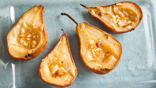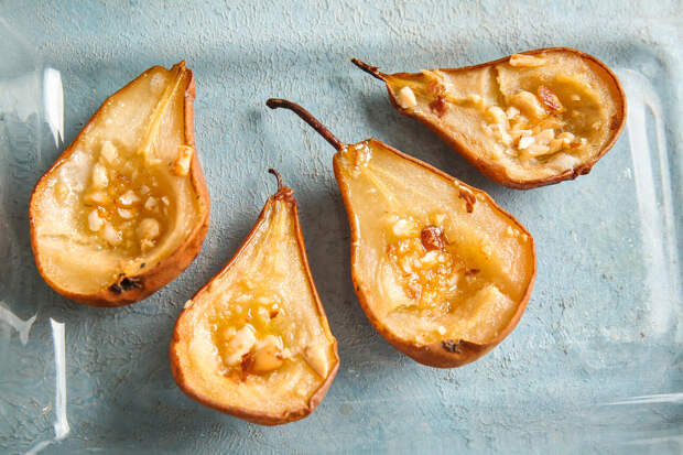 Переложите груши на сервировочные тарелки срезом вверх.