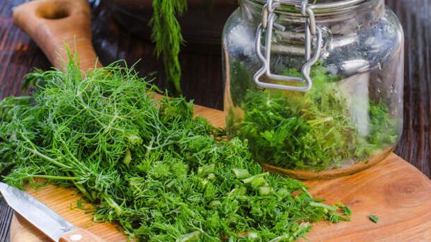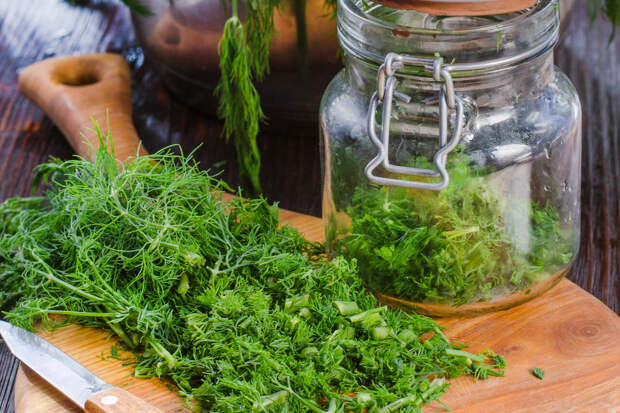 Один из вариантов — смесь «Зеленая богиня». Для ее приготовления необходимо взять большие пучки укропа, зеленого лука и петрушки, измельчить их в блендере, добавив чеснок, соль, сахар, лимонный сок и растительное масло. Не нужно строго следовать рецепту — все делается по вкусу. Полученную смесь можно заморозить в формочках для льда по порциям или в небольших стеклянных банках. Зимой она прекрасно дополнит горячие блюда, соусы или салаты, пишет автор канала «Вики рецепт».