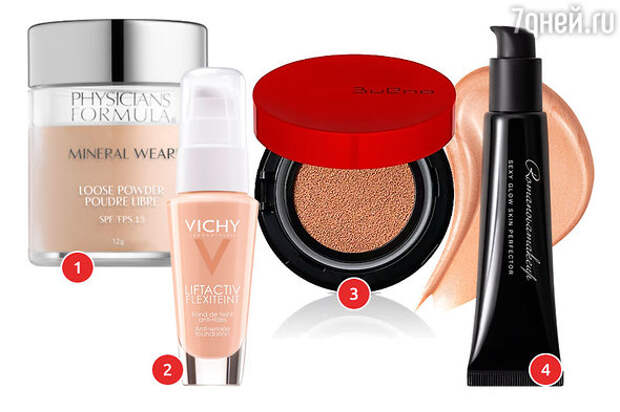1. Пудра рассыпчатая минеральная Mineral Wear physician formula. 2. Тональный крем с эффектом лифтинга Liftactiv Flexilift VICHY. 3. Кушон для лица Bueno. 4. Универсальный кремовый хайлайтер Sexy Glow Skin Perfector Romanpvamakeup.