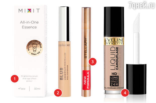 1. Праймер-лифтинг с комплексом пептидов Mixit. 2. Праймер Blur Lumene. 3. Консилер Cream Concealer Stellary. 4. Корректирующий консилер-камуфляж Liquid Camouflage Eveline.