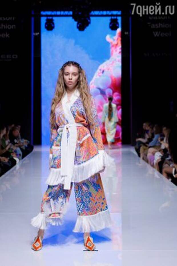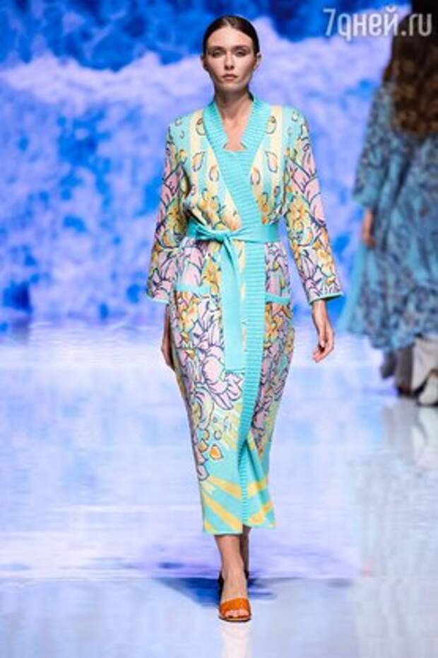 В тренде также остается и трикотаж, который был в изобилии представлен в коллекции бренда Maison Kaleidoscope. Она посвящена богине воды и женской водной стихии, ее энергии. Орнаменты и цветовая палитра напомнили собравшимся о завораживающем мире морских глубин.