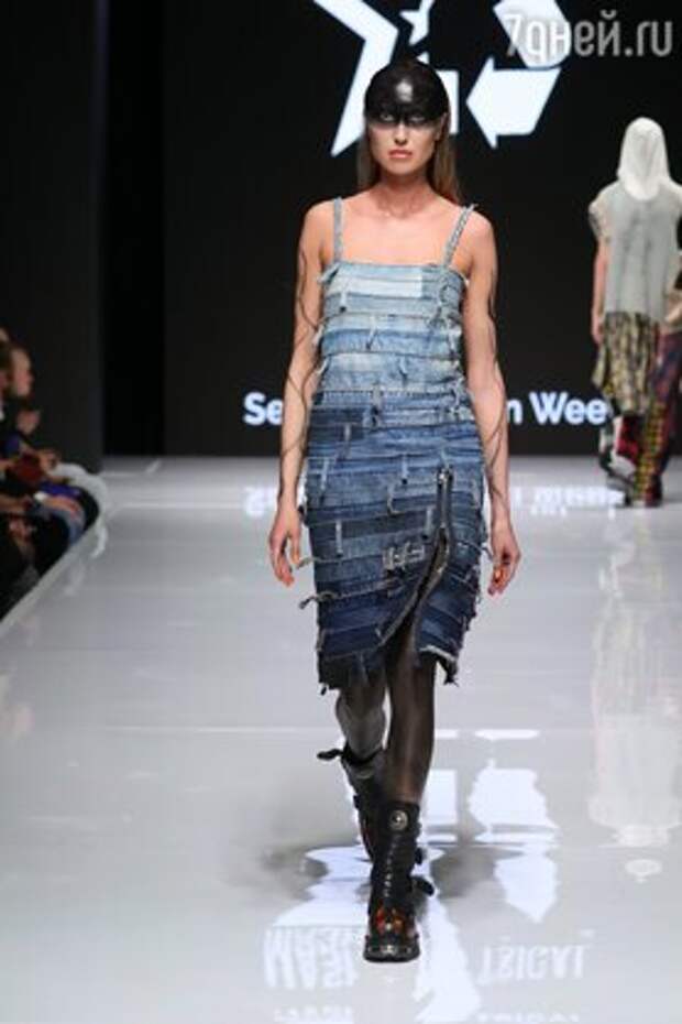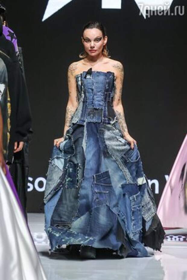 Кстати, маша Цигаль и сама вышла на подиум по традиции в конце показа и продемонстрировала вечерний вариант платья, сшитого как-будто из разных кусков старых поношенных джинсовых брюк и курток. Этот тренд, по мнению дизайнера, станет самым устойчивым уже в ближайшее время.