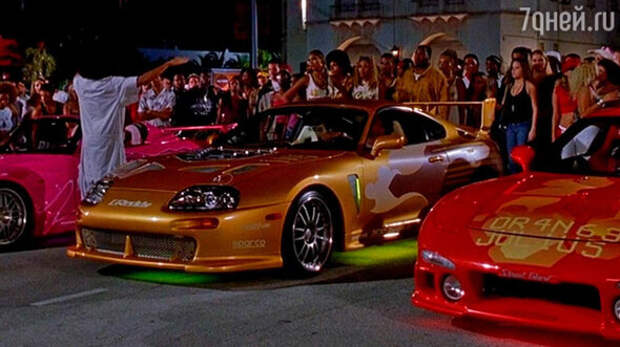 Последним соперником серебристого Skyline была золотисто-коричневая Toyota Supra. «Супра» может посоперничать со «скаем» не только в фильме, но и в жизни: по культовости и признанию она иногда опережает собрата, особенно, в последние года с ростом популярности автоспорта. Выпускалось четвертое поколение в 1993-2002 годах. Авто было очень дерзким и динамичным, с 3-литровым двигателем мощностью 280 лошадиных сил. Именно золотистая машина Слэп Джека была последним связующим звеном двух первых частей «форсажей» - это был один из дублеров оранжевой «супры» Брайана из первой части. Экземпляр, «игравший лицом» на крупных планах, прокачали по полной, снабдив мощной турбиной, выпускной системой и многими другими компонентами, повысив мощность до немыслимых 650 лошадиных сил. Однако без должной сноровки и знаний они могли превратить авто просто в бесполезную железяку: при первых испытаниях Supra чуть не свернула узлом свою же трансмиссию, буксуя до 100 км/ч около семи секунд. Чтобы этого не допустить, пришлось потратить немало времени и денег на настройку, но после этого машина начала разгоняться до сотни всего за 4,5 секунд.