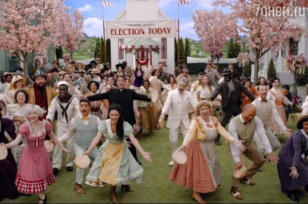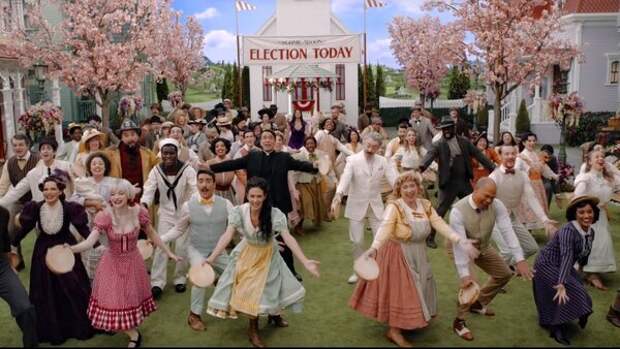 Тут есть, кажется, материал для пародии (вроде того, как герои пытаются остановить очередной певческий приступ горожан). И социальная сатира на американское общество (начиная от натянутых улыбок и заканчивая картонными декорациями идиллического сахарного субурбана).
