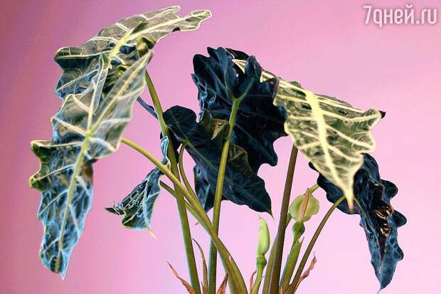 Броский внешний вид алоказии не оставит ее без внимания. Ее крупные темные листья на длинных черешках украшены контрастными светлыми прожилками. Форма листьев напоминает сердце с резными краями. К вопросам освещенности алоказия относится с легкостью: выдерживает предложенную тень. Однако в остальном тропическая красотка отчаянно требовательна. Ей нужно обеспечить повышенную влажность воздуха, устойчивый температурный фон, стабильную влажность грунта, а еще учитывать периоды покоя.