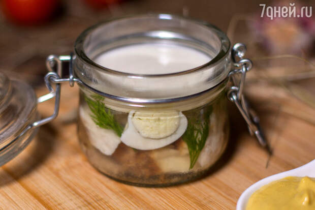 - В баночку для заливного положить ломаное филе сома, половинки отваренных перепелиных яиц, зелень.