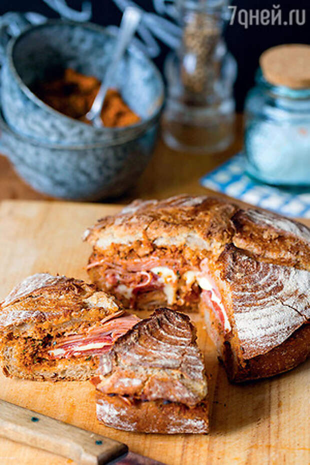 Сладкий перец запечь в духовке, закрутить в целлофановый пакет, остудить, затем снять кожицу и удалить семена. Из половинки лимона выжать сок. Запеченный перец, вяленые помидоры, оливки, листики петрушки, оливковое масло, лимонный сок, соль и молотый перец взбить в блендере в пюре. Вареную колбасу и салями тонко нарезать. Батон разрезать вдоль пополам, вынуть мякиш и намазать обе половины внутри овощным пюре. Положить в нижнюю половину батона три куска колбасы, три куска салями, три куска сыра, затем снова по три ломтика салями и вареной колбасы; накрыть все верхней половинкой хлеба и как следует придавить, чтобы «крышка» коснулась начинки. Отправить батон под гриль на три минуты, затем перевернуть и обжарить еще одну минуту (можно использовать сковородку-гриль). Поджаренный хлеб нарезать на порции.