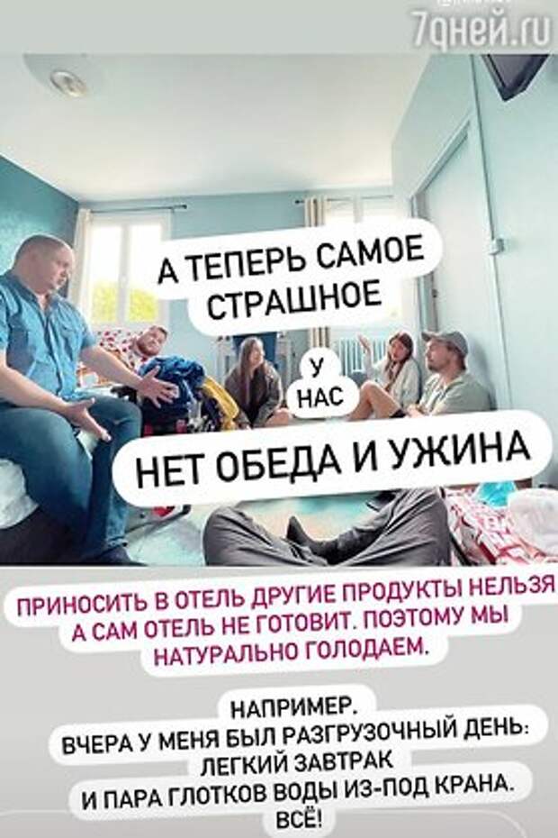 «Приносить в отель другие продукты нельзя. А сам отель не готовит. Поэтому мы натурально голодаем. Например, вчера у меня был разгрузочный день: легкий завтрак и пара глотков воды из под крана. И все!» — призналась телеведущая.