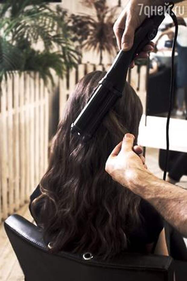 Отступив от корней 7-10 см, накрутить волосы, используя тройную плойку, но не трогать концы волос.