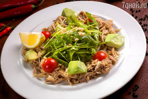 - Украсить салат помидорами черри и крупно рубленным авокадо.