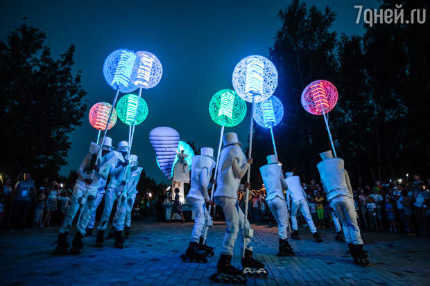 На площади более 10 000 кв. м развернется шоу с гигантскими летающими фигурами, масштабными декорациями и сценическими конструкциями в уличном пространстве — театральными подмостками для артистов в образе цветов, джамперов-птиц, танцоров, несущих звезды, воздушных акробатов и оперной певицей - богиней природы, катающейся на четырехметровой Луне.