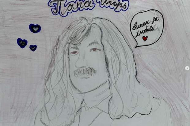 В комментариях отмечают, что юная художница очень точно изобразила Николаева, не забыв про его знаменитые усы. А чтобы сомнений не осталось совсем, еще и подписала рисунки, добавив известную фразу из хита: «Выпьем за любовь».