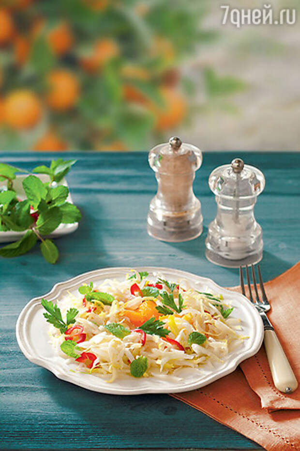 Апельсин очистить от кожуры, нарезать кружками и поместить в центр блюда. Цикорий тонко нарезать и выложить на апельсин. Перец чили, удалив семена, измельчить и добавить к цикорию с апельсином. Листья мяты и петрушки порвать руками и посыпать ими салат. Взбрызнуть все оливковым маслом, посолить, поперчить и дать салату слегка пропитаться.
