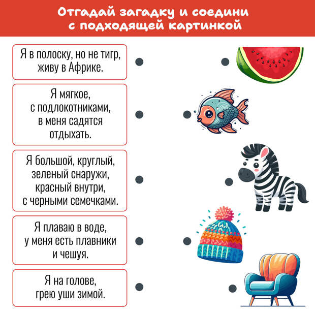 Распечатай и соедини. Распечатайте картинки и попросите ребенка карандашом соединить загадку с нужным изображением.